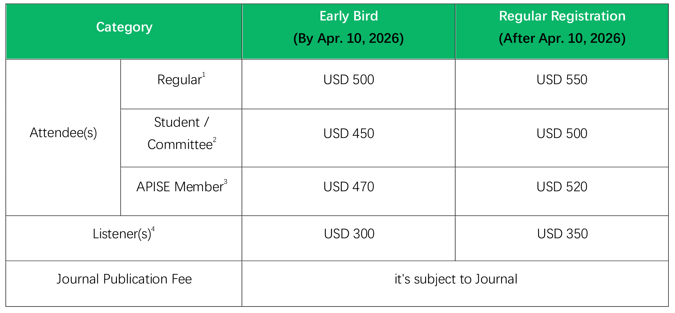 1Regular Attendee(s): Submit abstract and present at the conference, then recommend excellent one to Journal after conference.