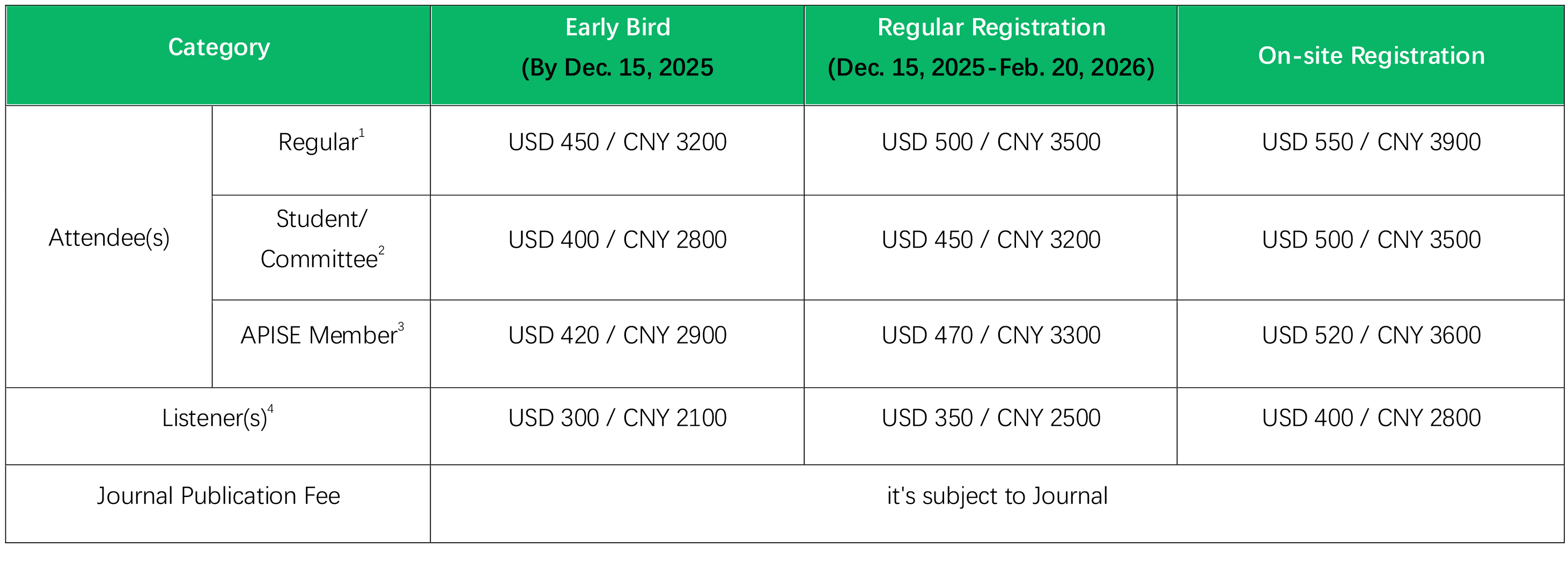 1Regular Attendee(s): Submit abstract and present at the conference, then recommend excellent one to Journal after conference.